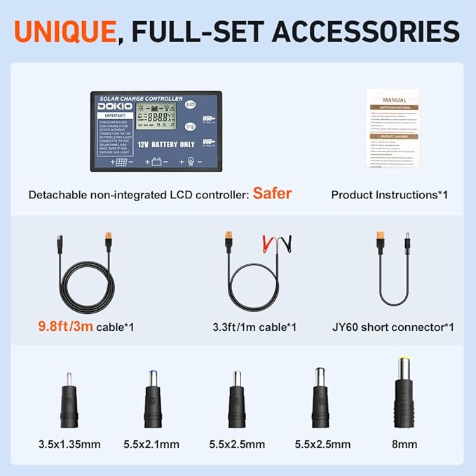 - 【ALL-IN-ONE KIT, READY TO GO】 Includes 100W foldable panel, standalone controller, SAE/XT60/alligator clips, 4 DC adapters (3.5×1.35mm / 5.5×2.1mm / 5.5×2.5mm / 8.0mm), 9.8ft cable, storage bag, and manual—everything you need for a quick setup out of the box.