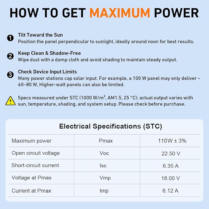 - 【CHECK YOUR POWER STATION’S INPUT LIMIT】 Some power stations cap input (e.g. 60W max). Even in full sun, the panel cannot exceed that cap—this is normal system design, not a defect. Please confirm your specs or message us before buying.