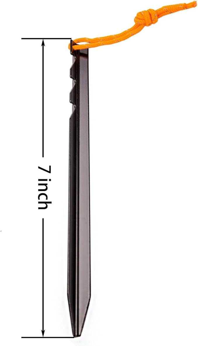 - Lightweight: 7075 aluminum ultra-light three-sided aluminum tent stakes; The Length of the stakes: 7 inch;