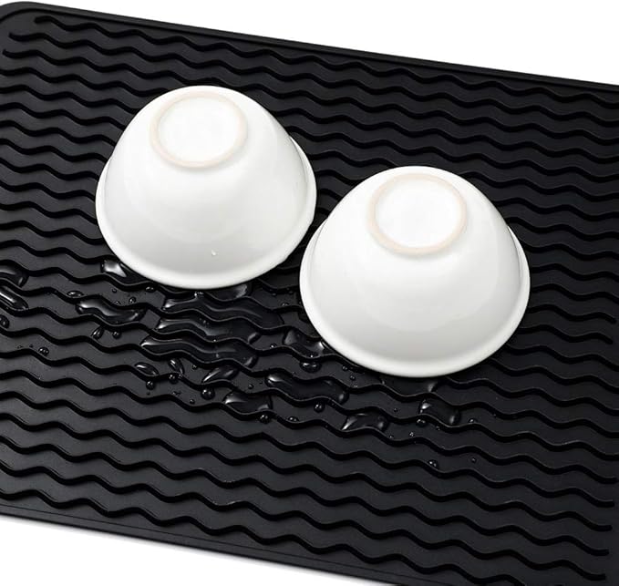 Silicone Dish Drying Mat for Multiple Usage,Easy clean,Eco-friendly,Heat-resistant Silicone Mat for Kitchen Counter or Sink,Refrigerator or drawer liner Black L 16 inches x 12 inches