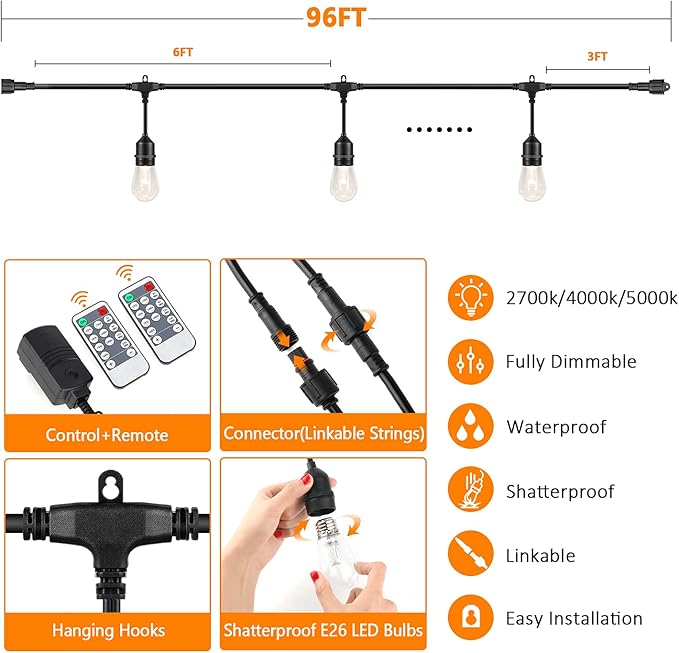 2-Pack 3 Color Dimmable LED Outdoor String Lights for Patio with Remotes, 96FT Waterproof Hanging Lights with Shatterproof Edison Bulbs for Bistro Backyard-Warm White/Nature White/Daylight White