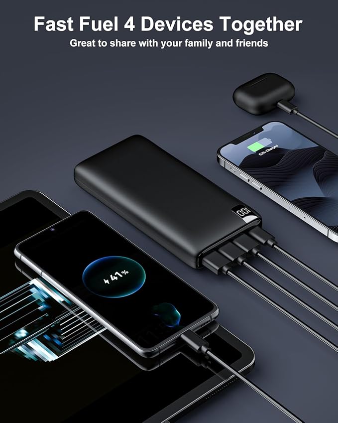 - 4 Outputs & 2.5X Fast Charge: It can charge 4 devices simultaneously and you can share it with your family and friends. 3.0A fast charging speed ensures 2.5 times faster than ordinary power bank, greatly shortens charging time for your phones.