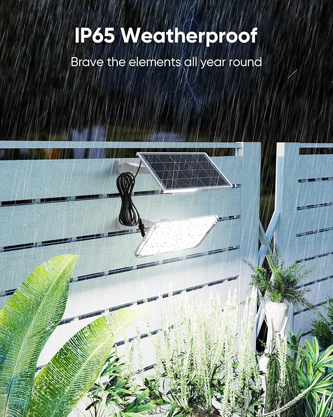 - IP65 Waterproof for Outdoors: Tightly encased with high-strength PC/ABS material, the solar flood light is rated IP65 waterproof, withstanding rain, wind, snow, ice, and low/hot temperatures. Perfect for any outdoor location, such as the front door, back yard, porch, patio, barn, garage, shed, fence, and light pole.