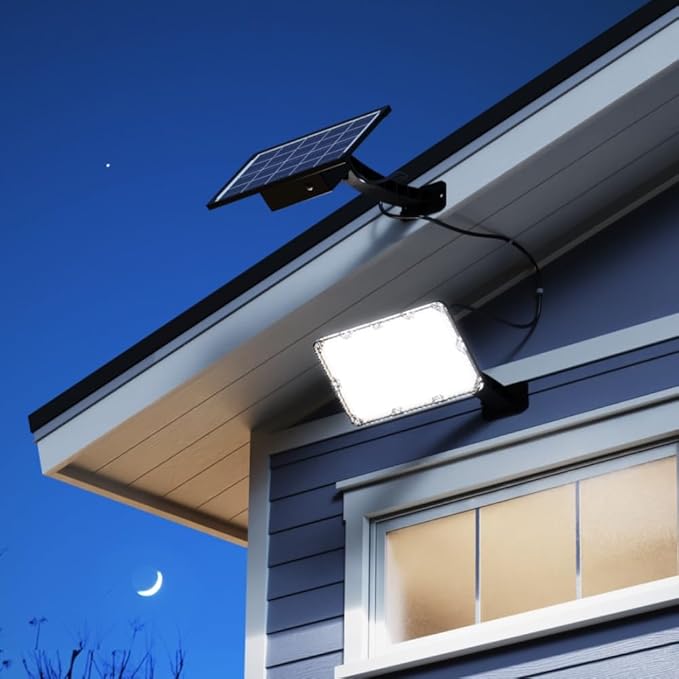- 16.4ft Longer Extension Cord: JACKYLED dusk to dawn solar light has upgraded the cord length from 9.8ft to 16.4ft, allowing the solar panel to be installed in a longer distance where it absorbs more sunlight, like on the rooftop. With a longer cord, you can also select the light panel’s installation location from a wider range, whether outdoors or indoors. (Note: This solar flood light runs from dusk to dawn, it has no motion sensor)