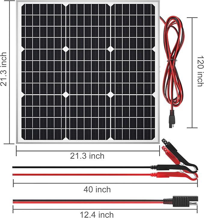 - 【High Conversion Rate】This 50W solar panel with monocrystalline A+ solar cell has an excellent cell efficiency of 21%-30%. Designed to charge and maintain 12V rechargeable batteries like LiFePO₄, Lithium Ion, AGM, SLA, GEL, EFB, MF, etc. Keep batteries charged for trailer, tractor, truck, boat, motorcycle, RV, car, lawn mower, water pump, gate opener, electric fence, etc