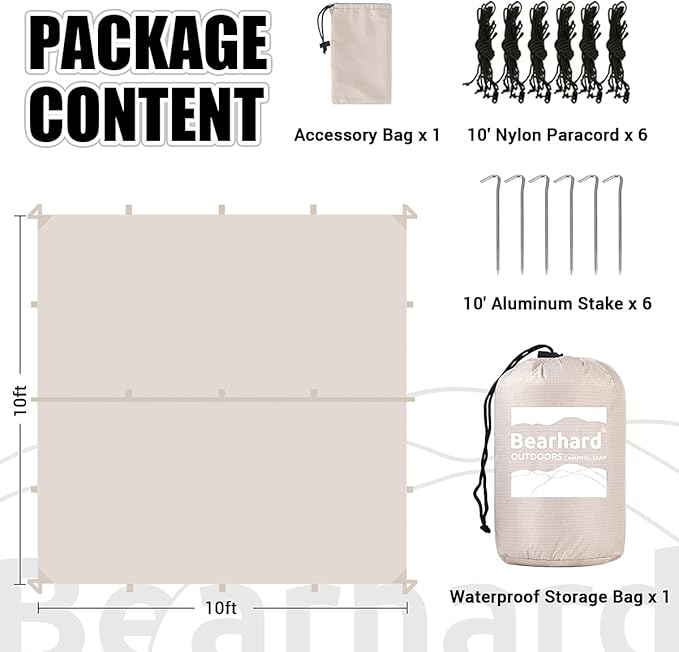 - [VERSATILE MULTI-PURPOSE TARP] Bearhard tarp is designed for use as a camping tarp, hammock rainfly, tent footprint and more. Constructed with durable materials and reinforced stitching, this lightweight and easy-to-set-up tarp is suitable for various outdoor activities such as camping, hiking, fishing, backpacking, climbing, and hunting.
