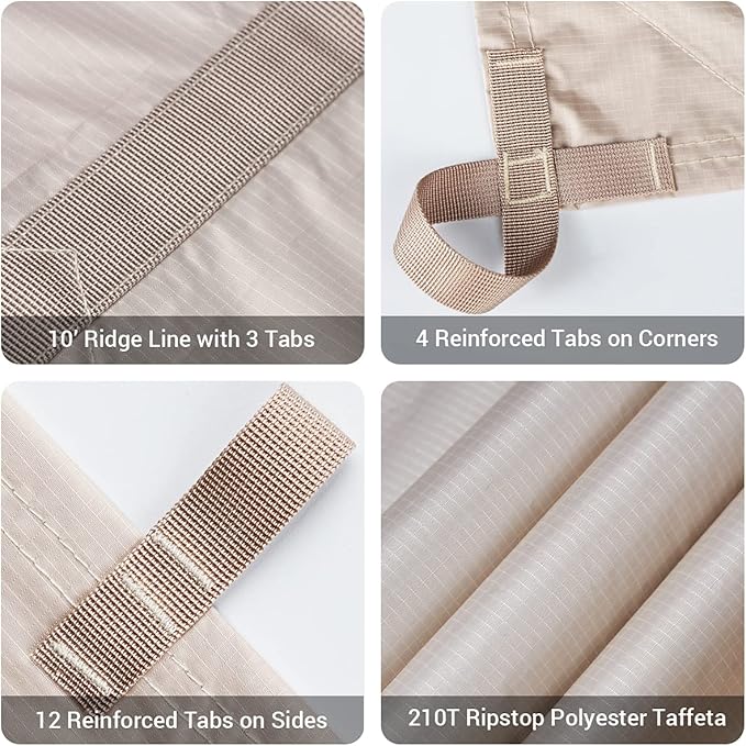 - [ALL-ROUND REINFORCED DESIGN] Features 19 reinforced pull tabs (12 along the sides, 4 on the corners) with double-stitched edges for maximum durability. Includes a 10ft Oxford ridge line with 3 extra tabs plus leak-proof treatment, making this shelter tarp both versatile and built to last