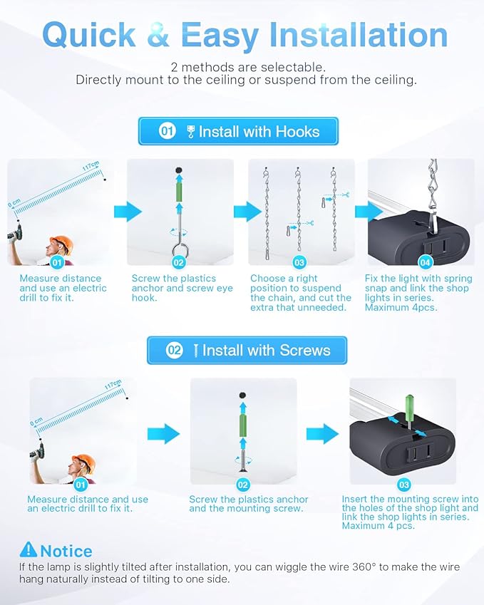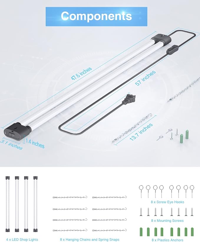 - đź’ˇEasy Installation - Plug & Play. These 4FT led shop lights can be directly mounted to the ceiling or suspend from the ceiling in your garages, workshops, basements, etc. Quick and easy setup.