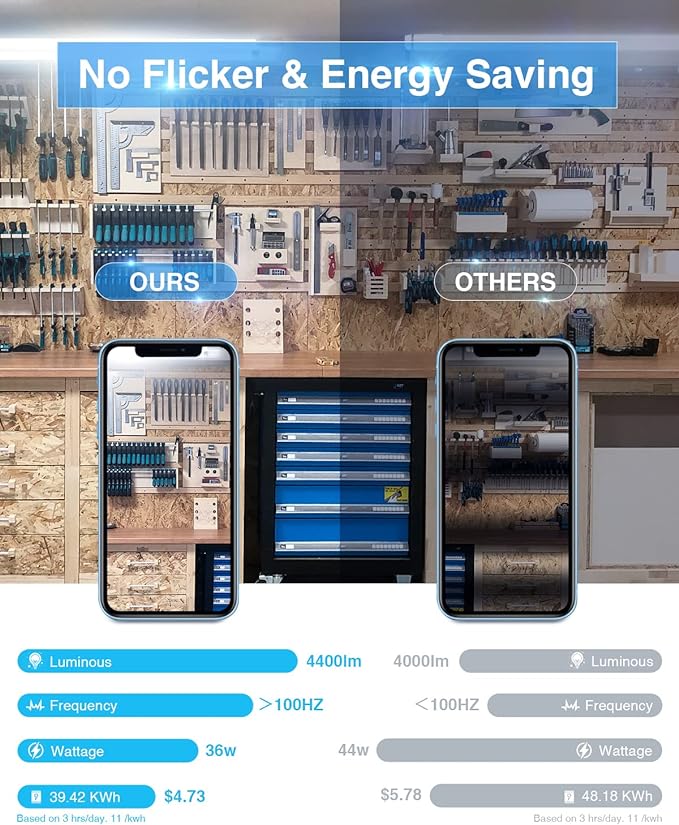 - đź’ˇSuper Bright - Our 4 ft shop light can provide 4400 high lumens with only 36W. It is an amazing LED efficiency of 122 lm/w! Excellent replacement for old fluorescent lamps! Energy saving of up to 80%.