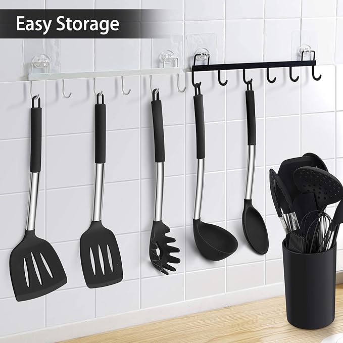 - Easy clean and store, our cook utensils features a loop at the end of the handle for easy hanging, utensil holder attached keeps these utensils handy and easy storage, dishwasher safe makes cleaning a breeze, easy to clean even by hand wash