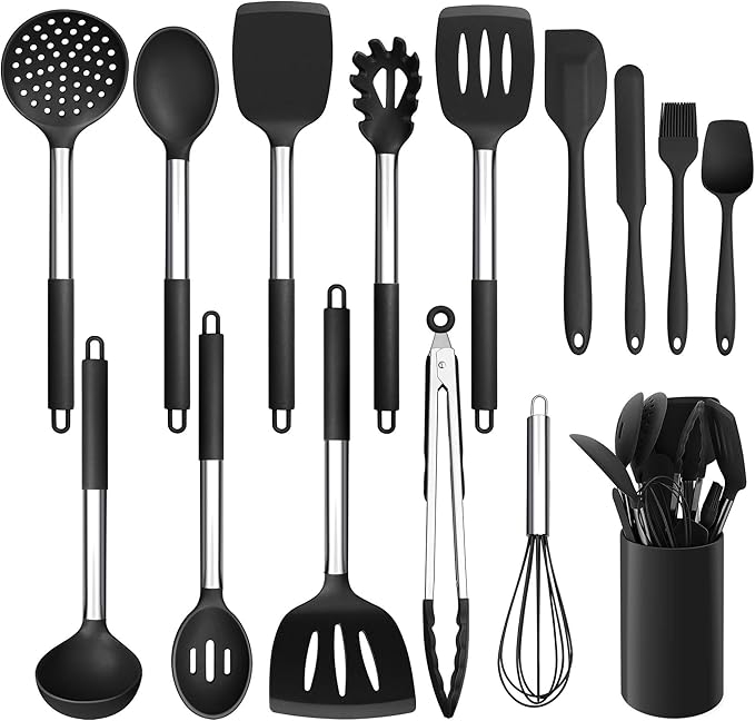 LIANYU 15-Piece Kitchen Cooking Utensils Set with Holder, Silicone Kitchen Tools Stainless Steel Handle, Slotted Spatula Spoon Turner Tong Whisk Brush for Cooking, Black