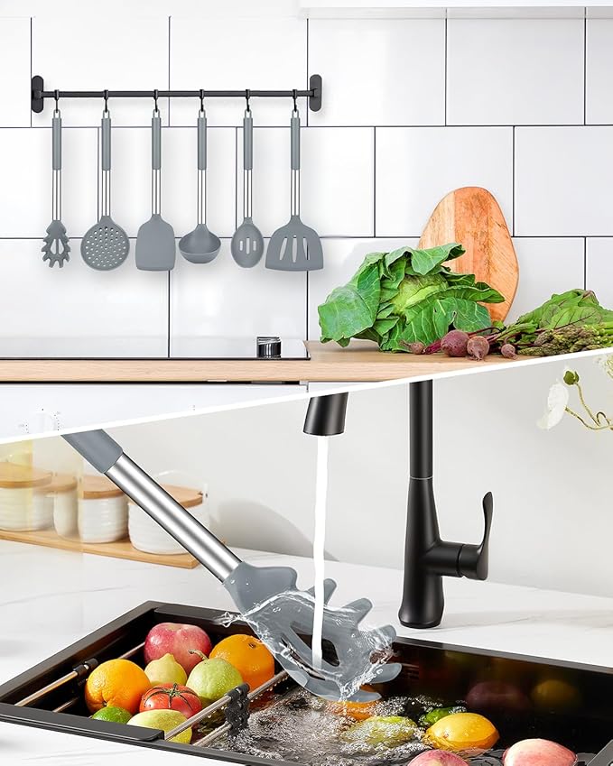 Silicone Cooking Utensil Set, 8Pcs Non-stick Cookware with Stainless Steel Handle, BPA Free Heat Resistant Kitchen Tools with Spatulas, Turnesr, Spoons, Skimer and Pasta Fork (GRAY)