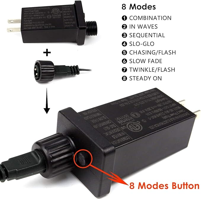 - Unique 8 Lighting Modes: This twinkle lights have 8 modes to fit different occasions, moods, feelings, holidays, festivals, anniversaries, etc. (Combination, In waves, Sequential, Slow Glow, Chasing/Flash, Slow fade, Twinkle/Flash, Steady on). Adjust the lighting modes by pressing the round button on the adapter.