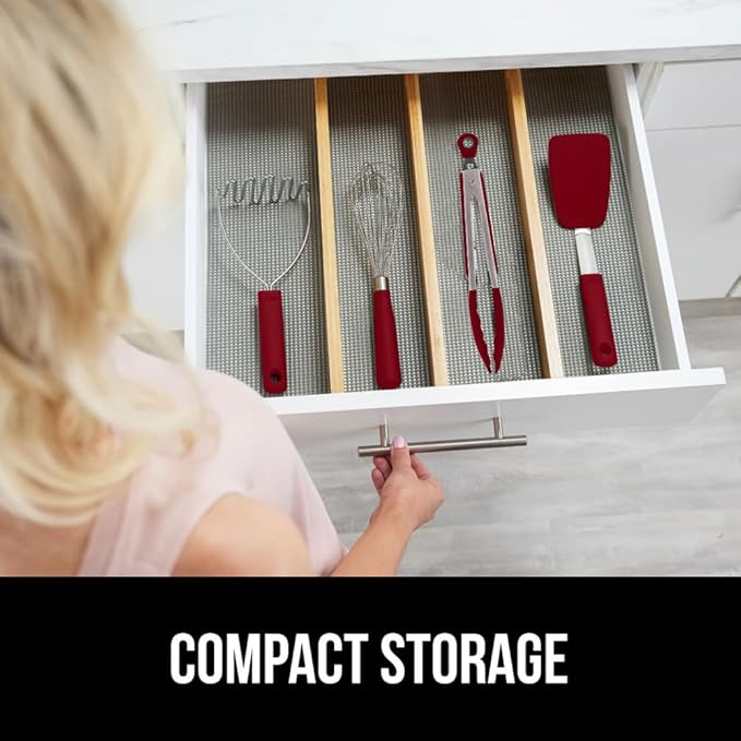 GORILLA GRIP Stainless Steel Heat Resistant Kitchen Tongs for Cooking, Set of 2 BBQ Tong, Non Scratch Silicone Tip for Pans, Strong Grip, Grab Food, Toss Salad, Air Fryer, Pull Lock, 7 + 9 Inch, Red