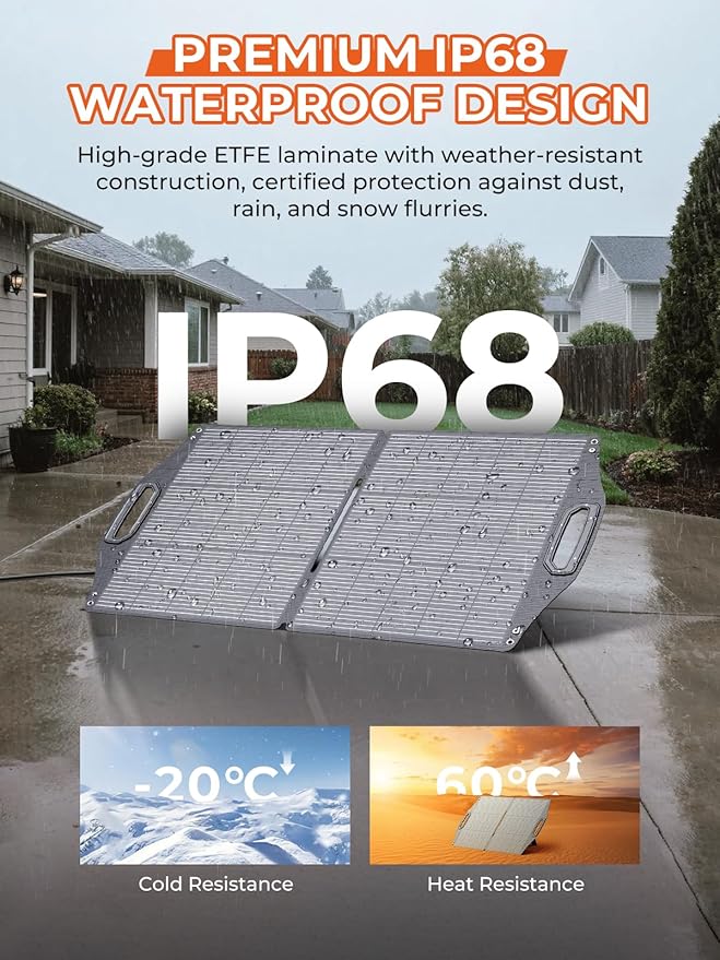 - ROBUST KICKSTANDS & PORTABLE DESIGN: Integrated kickstands optimize solar absorption angles for peak energy harvest. Ergonomic handles enable effortless deployment and storage. This ultra-slim portable solar panel maximizes travel convenience with a sleek folded profile (20.91×21.77×1.38 inches) and lightweight 6.47-pound construction