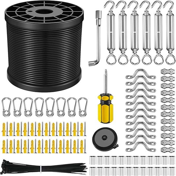 NEREUS String Light Hanging Kit with 250 Ft Vinyl Coated 304 Stainless Steel Cable, String Light Suspension Kit, Guide Wire with Turnbuckles and Hooks for Patio, Backyard Lighting Accessories