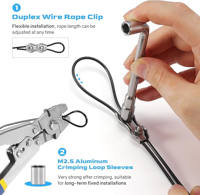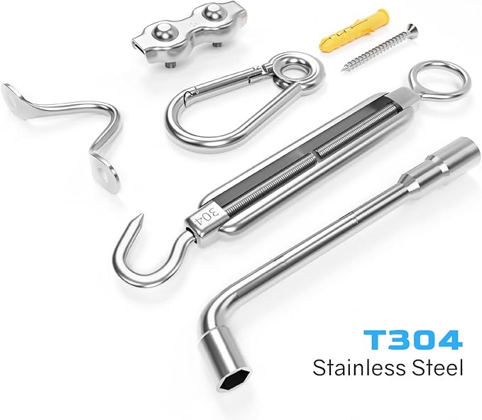 - 【Easy Installation】-It’s sturdy outdoor light guide wire winding around the coil bobbin to prevent tangling. Each part is connected by thread, easy adjust wire rope cable tension using the push-button on snap hook and you can disassemble with your own hands.