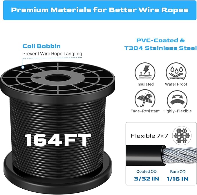 - 【High Quality Material】-Our string light kit is made of US ASTM standard 304 stainless steel, 7 x 7 strands construction, bare OD is 1/16",coated OD is 3/32". The black coated Stainless Steel Cable is Insulated and waterproof, rust-resistant and able to bear any bad weather condition like intensive sun exposure and heavy rain. 480lbs breaking strength ensures its outstanding durability and long-lasting secure hold for the string lights without snagging once pulled tightly.