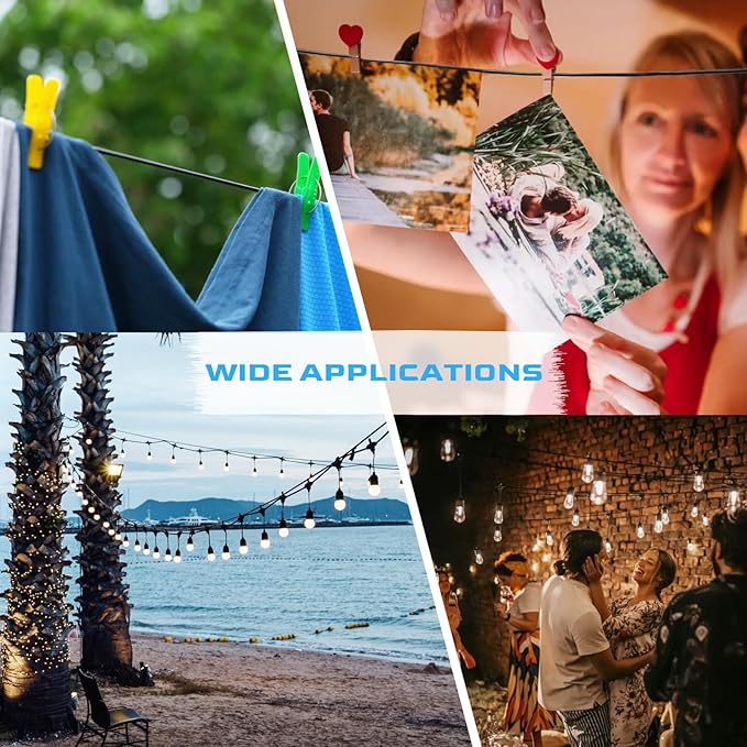 - 【Wide Application】-Our guide wire for string lights can be used in multiple ways such as This product is suitable for patio string light kit, string light pole, photo frames, clothes, shade sails. You can shape different lighting suspension types to enhance the visual effect according to different of occasion, indoor or outdoor. Using your imagination, Decoration, create Atmosphere and enjoy the fun of DIY.