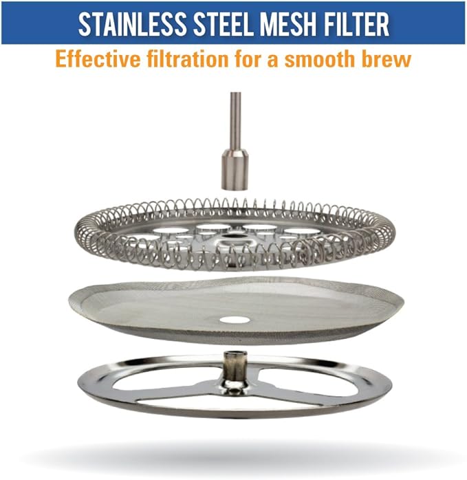 - Bolder Flavors & Aromas: The French press features an ultra-fine mesh filter that perfectly filters coffee grounds and teas to reduce acids and eliminate the taste of a paper filter. The food-grade quality of our French press stainless steel pot also ensures a fresh, non-metalic taste.