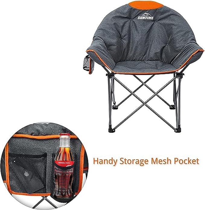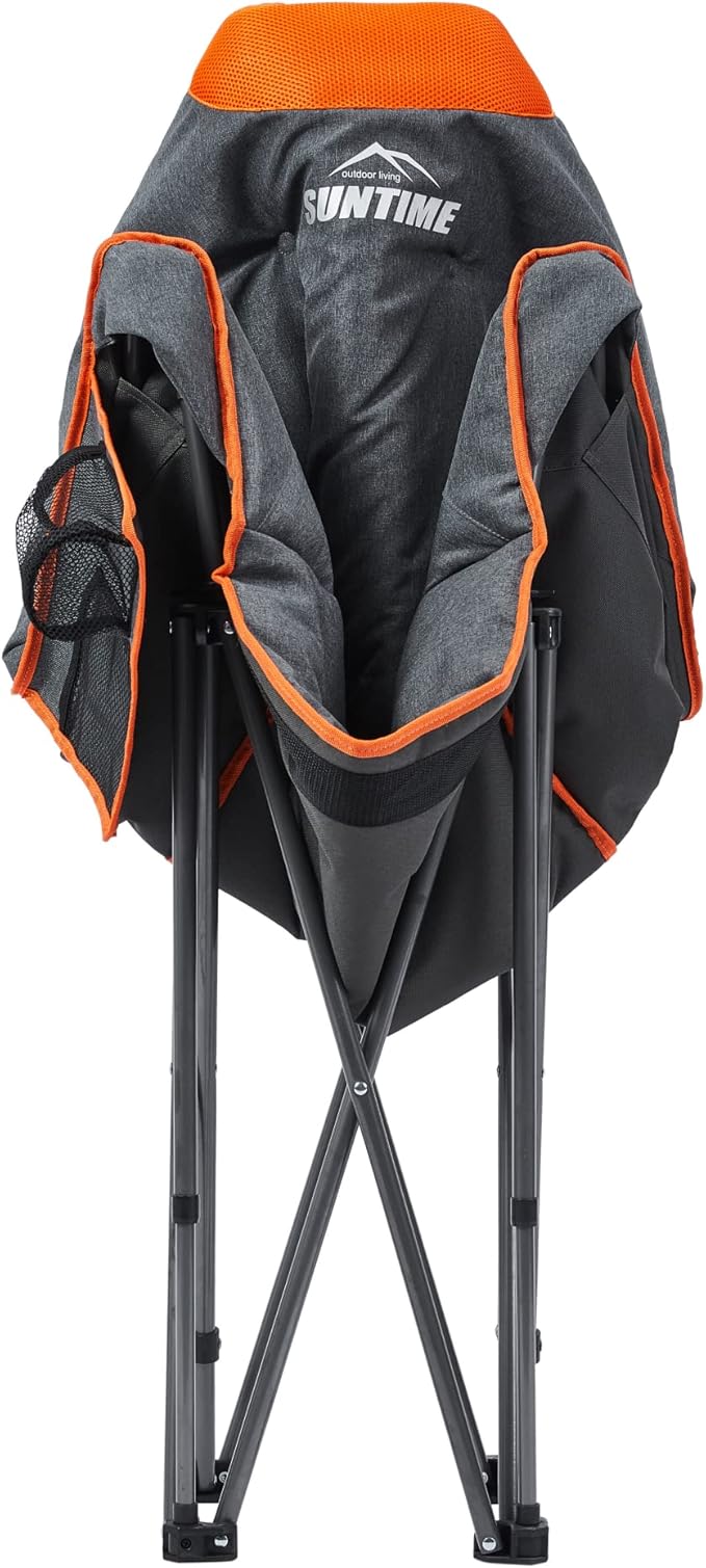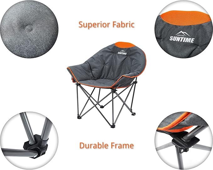 - COMFORTABLE DESIGN: This Suntime portable folding camping chair is an oversized moon round saucer shape, ergonomic design, which provides a large area of a comfortable seat. The removable footrest can extend 26 inches for your legs rest, provides more comfort in your leisure time