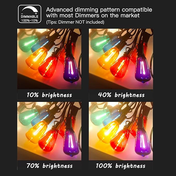 - LED Colored Outdoor String Lights - Multicolor patio string lights with colored edison bulbs, creates a relaxing and romantic atmosphere for your holiday party. There are 5 colors of the bulbs: red, green, blue, orange and purple. It's ideal lighting and decoration for outdoor, indoor, garden, deck, porch. Warm tips: remote control and dimmer not included, can't change the color of the light.