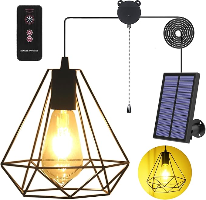 - 【CLASSIC STYLE】This solar pendant light has both classic elements and modern style with black hard wire metal cage, it casts a beautiful shadow on ceiling.Solar panel and light body are designed separately, no wiring electricity, installation anywhere.It is perfect to install at door entry, hallway, patio, in the yard, under the trees and tool room or garage.