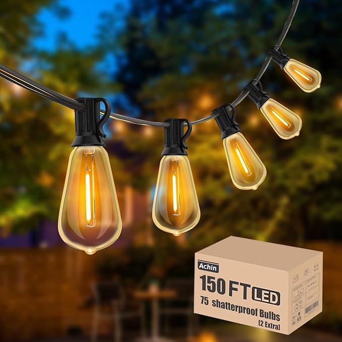 Achin Outdoor String Lights 150FT LED ST38 Edison Vintage String Lights Outdoor Dimmable Warm 2200K with 75 Shatterproof Bulbs Plastic String Lights Waterproof for Patio Bistro Gazebo Lights