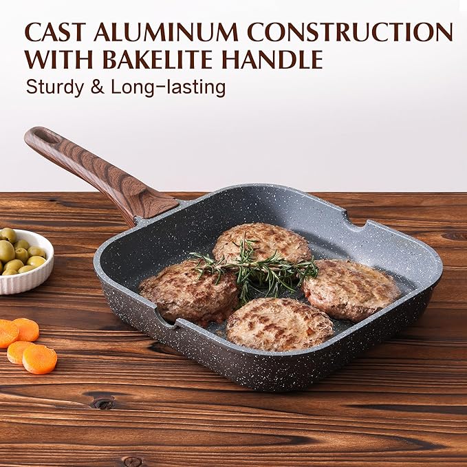 - Sturdy & Durable: This grill pan is made of die cast aluminum, stury and no warp. The bakelite handle features comfortable to grip and stays cool to the touch.