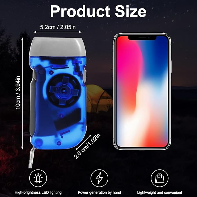 - Portable Size: each hand flashlight is about 10 x 5.2 x 2.6 cm/ 3.94 x 2.05 x 1.02 inches, easy to carry when going out, which can be put into handbag, backpack side pocket, and it can be powered by hand when the flashlight is out of power, meeting emergency needs while not giving you outdoor adventure adds burden