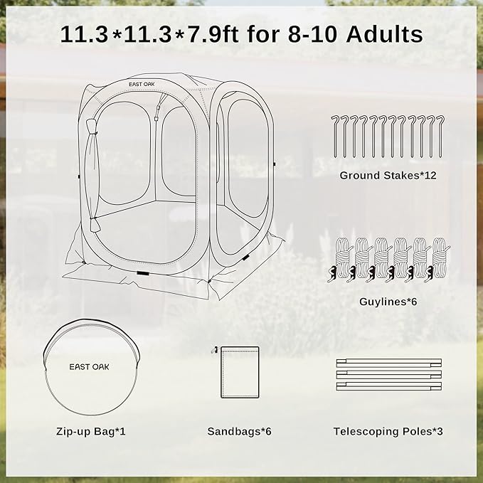 - ๐ฃ๐ผ๐ฝ-๐๐ฝ ๏ผ ๐๐ฎ๐๐ ๐๐ผ ๐ฆ๐ฒ๐ ๐๐ฝ ๐ผ๐ฟ ๐ฆ๐๐ผ๐ฟ๐ฎ๐ด๐ฒ : Suitable for 8-10 people, EAST OAK portable screen house features a convenient pop-up design that allows for easy installation by a single person in about one minute. Designed to be easily folded, the tent comes with a convenient carrying bag. Its dimensions are 33.5*3.9*33.5 inches, making it easy to store.