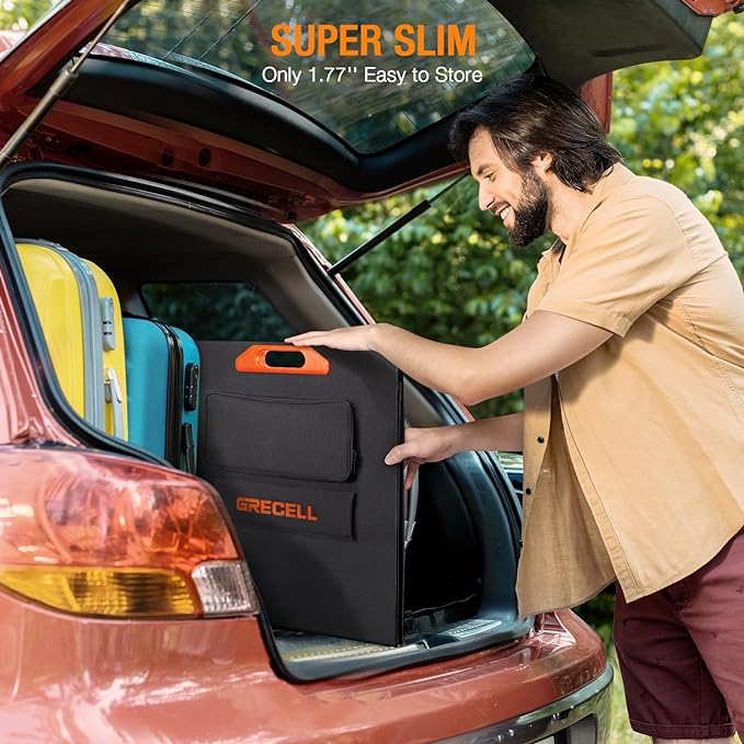- PORTABLE & SUPER SLIM - With a folded size of 21.46*22.95*1.77 inches and a lighted weight of only 10.14lbs, the GRECELL UB200 is 30+% lighter than other 200W solar panels and more portable with one hand. With super slim unfolded thickness:0.98inch, it will not take up much space when stored or used. 4 adjustable kickstands, 4 metal reinforced mounting holes to help you fold/hold/hook it up anywhere. Tips: For best results, we recommend using GRECELL solar panels with GRECELL solar generators.