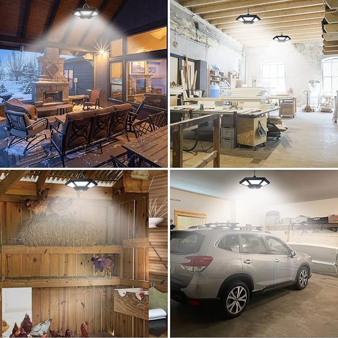 - 【Remote Control & Outdoor Indoor Use 】The solar shed light can switch 6 modes by remote control to turn the light on/off within a distance of 3-20 feet. Press the "+/-" switch to adjust 4 brightness levels to meet different needs. This solar chandelier has a separate design for the lamp body and solar panel, so you can put the solar panel outdoor to charge while hanging the solar light to work indoors. Provide lighting for your coop, shed, walkway, front door, hallway and more.