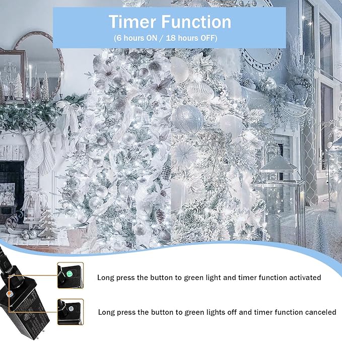 - Timer Function and Memory Function: With built-in timer IC, long press the button of the adaptor to green, the timer function activated and it will be on for 6 hours and off for 18 hours repeatedly everyday. The Xmas lights also have memory function, will remember your last lighting mode, free your hands from pressing the button everyday.