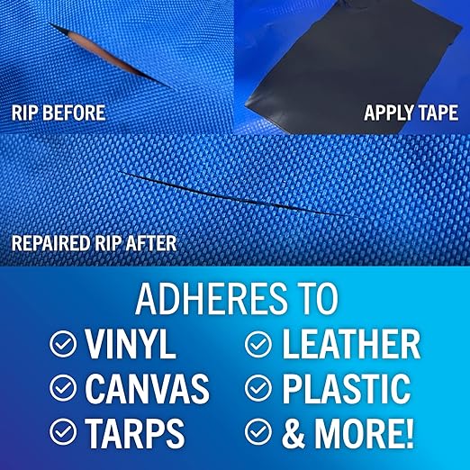 - REPAIRS TEARS & RIPS IN AWNINGS, CANVAS, TENTS & MORE: Our black repair tape or vinyl repair tape is heavy duty making it a highly effective aid for a pop up camper, bimini top, pontoon boat seat, RV, tarp, canopy, bed, sail and tent repair tape.