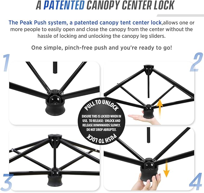 - EASY SETUP: This easy setup pop up canopy tent features the Peak Push system, a patented canopy center lock. The portable canopy requires no tools and easily opens and closes from the center in seconds. Its unique canopy tent center lock enables a quick, one person setup, letting you maximize outdoor time with minimal effort