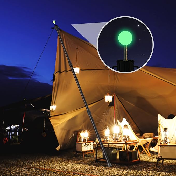 - 【Tear and Slip Resistant & Glowing Cap】The top of awning poles with a removable spherical tip cover, glow in the dark, made of TPR insulation material, can prevent lightning strike. Note: The glow-in-the-dark caps on the pole tips are soft and couldn't support a tarp that's too heavy, so it's recommended that you use the pole tips to go through the tent grommets and then fix the tent with the tip caps.
