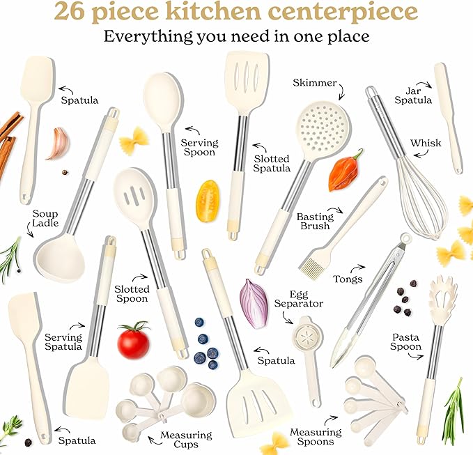 - Kitchen utensils: 26 sets of utensil sets includes, flexible spatula, soup spoon, serving spoon, pasta server, spatula turner, tongs, massage cup and spoon, 10 hooks, silicone mat, etc. Meet your various kitchen needs