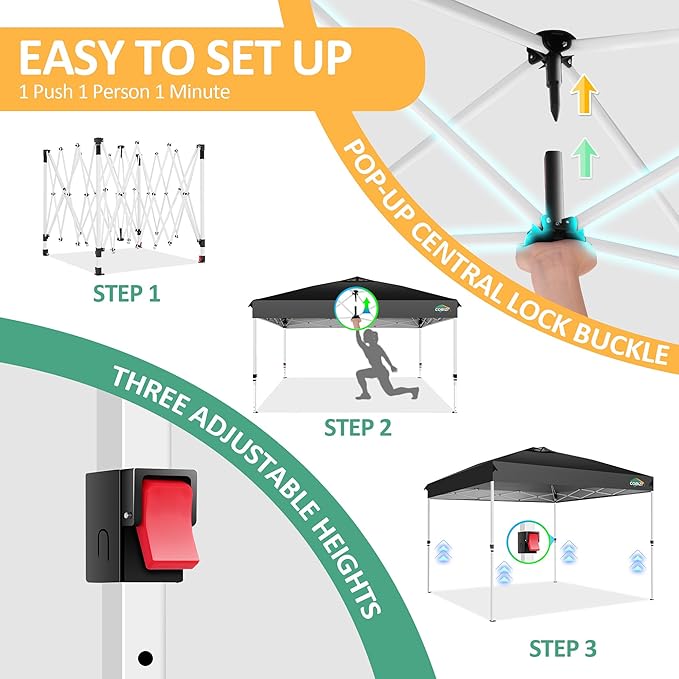 - 【One Push】COBIZI canopy tent 10x10 is conveniently designed with pre-installed frame and one push lock design. No tools are needed, just push the center lock upwards to quickly fix the frame, and finally install the sidewalls to easily complete the installation