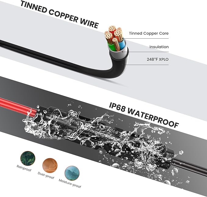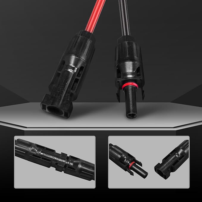 - 【Durable Easy to Use】Plug and play, no additional installation tools required. Quickly and easily connect or disconnect by simply pressing both sides of the built-in lock on the male solar connector with your fingers, the connection is firm and not easy to fall off.