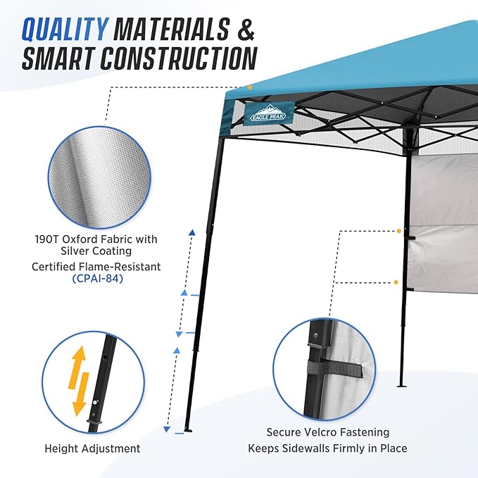 EAGLE PEAK 8x8 Pop Up Canopy Tent with Sidewall, Compact, Portable Slant Leg Instant Sun Shelter for Beach, Sports, & Camping, 8x8 Base 6x6 Top, Light Blue