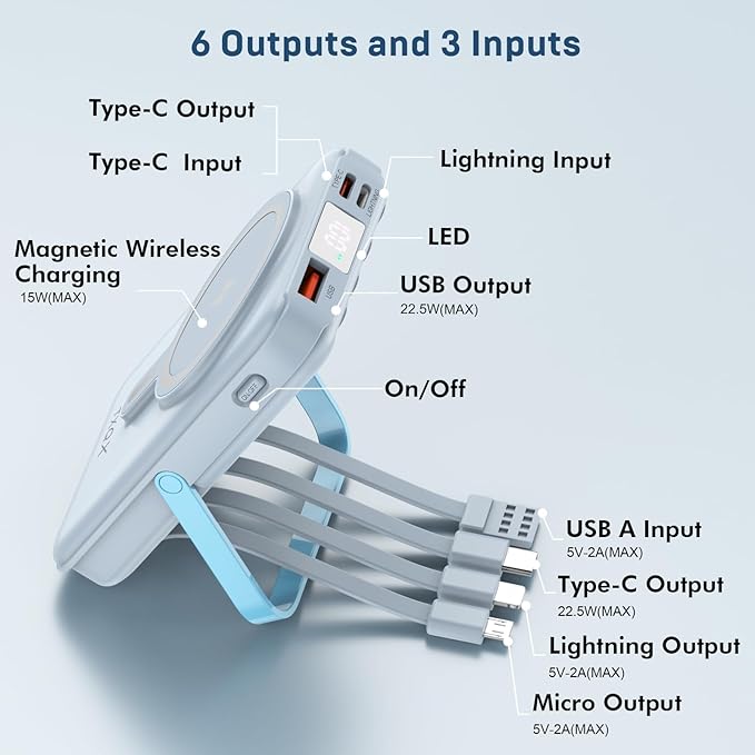 - 【6 Outputs and 3 Inputs】Wireless Portable charger has 6 outputs and 3 inputs, you may charge 6 devices max at the same time, recharge battery pack with 3 input options easily. Magnetic wireless charger built-in 3 output cables and 2 outputs port(1 USB-C port and 1 USB-A port) and 1 magnetic wireless charging (Total 6 outputs), great for multi electronics users who has iPhone, android or micro devices. It also built-in 3 inputs (1 built-in USB-A recharging cord/cable, 1 USB-C input, 1 iPhone input), which you can use any one of them to recharge Magnetic battery pack conveniently.