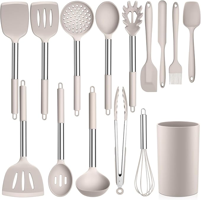 LIANYU 15 Pcs Kitchen Cooking Utensils Set with Holder, Silicone Kitchen Tools with Stainless Steel Handle, Heat Resistant Gadgets, Brush Spatula Spoon Whisk for Cookware, Dishwasher Safe, Khaki