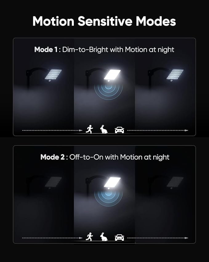 - 3 Lighting Modes at Night: 1. The solar security lights turns full brightness from dim light when sensing motion (Dim-to-Bright with Motion); 2. The light turns on from off when sensing motion (Off-to-Bright with Motion); 3. The light stays on from dusk to dawn.