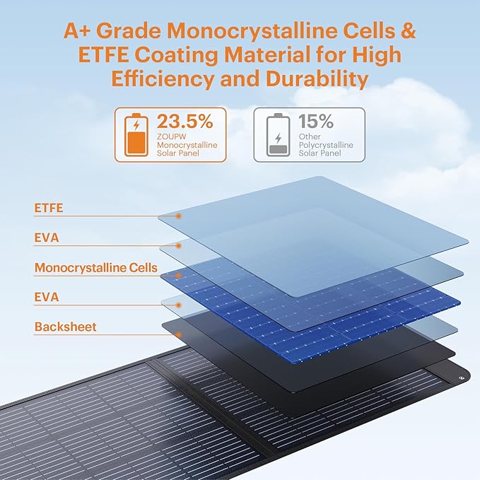 - 【A+ Monocrystalline Solar Cells for 23.5% Conversion Efficiency】ZOUPW 200 watt solar panel utilizes A+ monocrystalline solar cells, achieving an outstanding conversion rate of 23.5%. This 200w solar panel performs well in low-light conditions, surpassing the performance and stability of similarly-rated polycrystalline solar panels.Also this portable solar panel is designed with an auto-optimization feature that automatically reconnects when sunlight returns after a charging interruption.