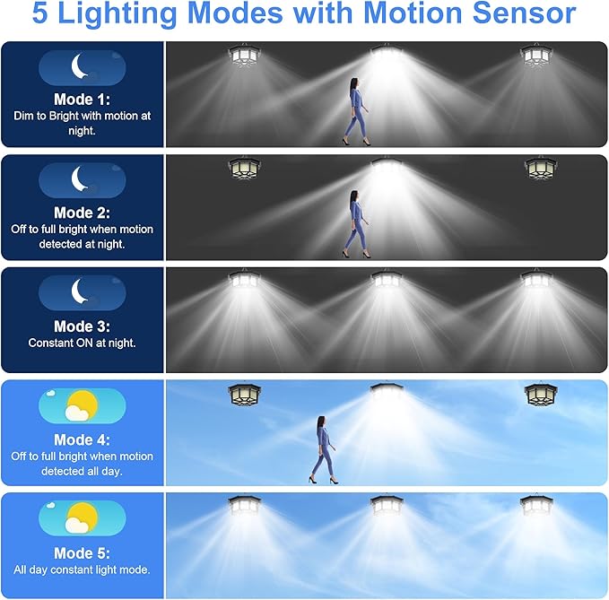 - 5 Lighting Modes & Motion Sensor: Our motion solar shed light has 5 lighting modes to meet your diverse needs. (Sensing Time Adjustable: 25S / 35S / 45S) Mode 1: Dim to Bright with motion at night. Mode 2: Off to full bright when motion detected at night. Mode 3: Constant ON at night. Mode 4 : Off to full bright when motion detected all day. Mode 5: All day constant light mode. Modes 1, 2, and 4 are motion-sensor modes