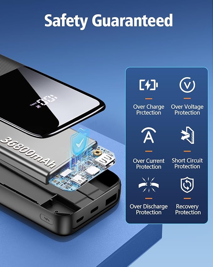 - Special Feature : Portable Charger Power Bank with Built-in Cables, Digital Display, 36800mAh, 22.5W QC4.0 Fast Charging, USB C Output, USB A Output, Charge 3 devices Simultaneously Portable Charger Power Bank with Built-in Cables, Digital Display, 36800mAh, 22.5W QC4.0 Fast Charging, USB C Output, USB A Output, Charge 3 devices Simultaneously