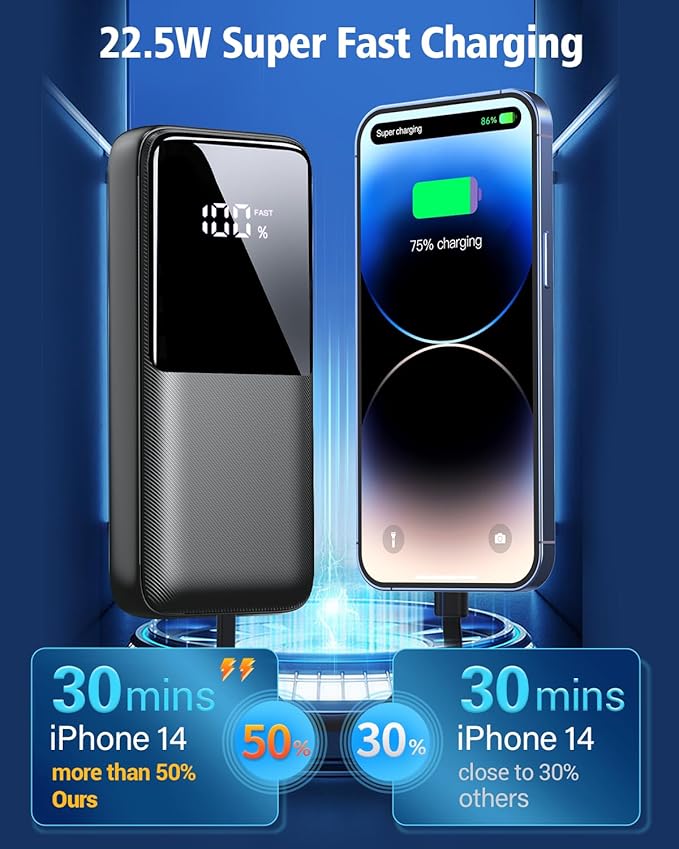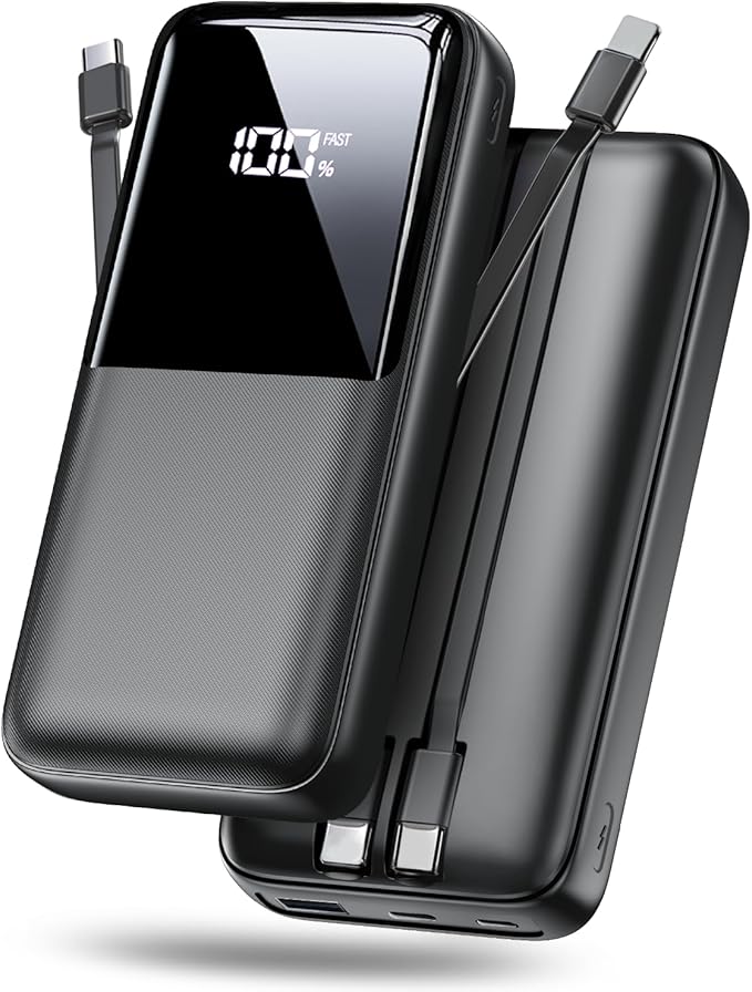 - [Portable Charger with Built in Cables]: Multifunctional power bank with built-in iOS cable and Type-C cable, which supports charge almost all smart devices. Widely compatible with iPhone 15/14/13/12/11 series, iPad series, Samsung S23,S22,S21,S20 series and other cell phones, tablets or electronic devices. All in one portable charger, no need to carry various cables or adapter any more! (*Airline NOT allowed*)