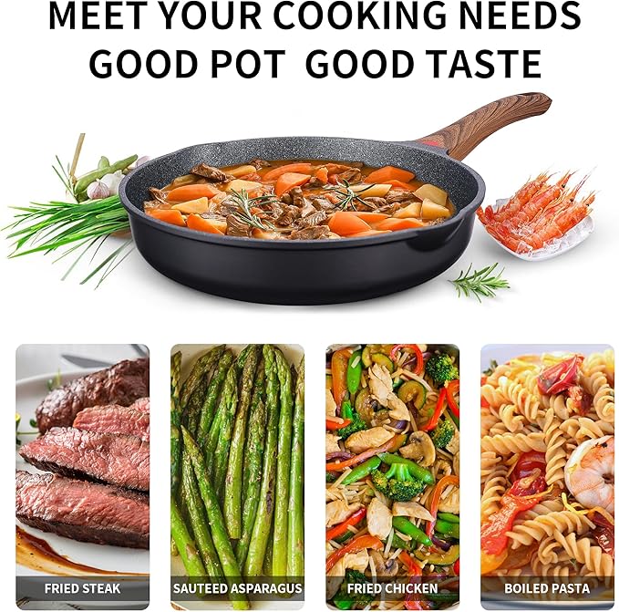 - Induction Bottom - The nonstick skillet bottom is flat and thick, which helps distribute heat evenly and quickly. The induction bottom of the skillet is suitable for all types of cooking,including electric and ceramic cook tops Gas stove,glass top and induction compatible. Recommended for daily use,indoor,outdoor as well as camping.