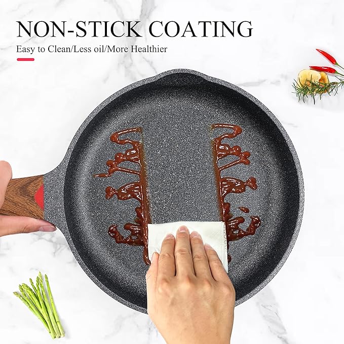 - High Quality Skillet Pan - Our sauce pan with Aluminum Die Casting process, well made quality,heavy duty, PFOA/PTFE free and non toxic. With thoughtful design of two pour sprout can bring convenience for your either hand. The bakelite handle features wood grain design, it is comfortable to grip and stays cool while cooking.